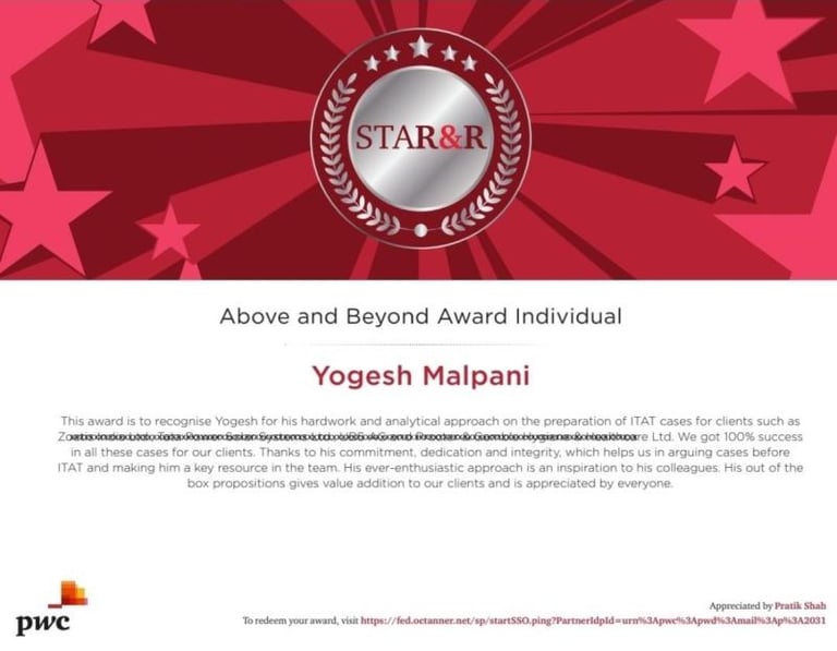 His work has earned him several accolades, including the prestigious PwC Chairperson's Award (2025) for his contribution to a GAAR assignment.